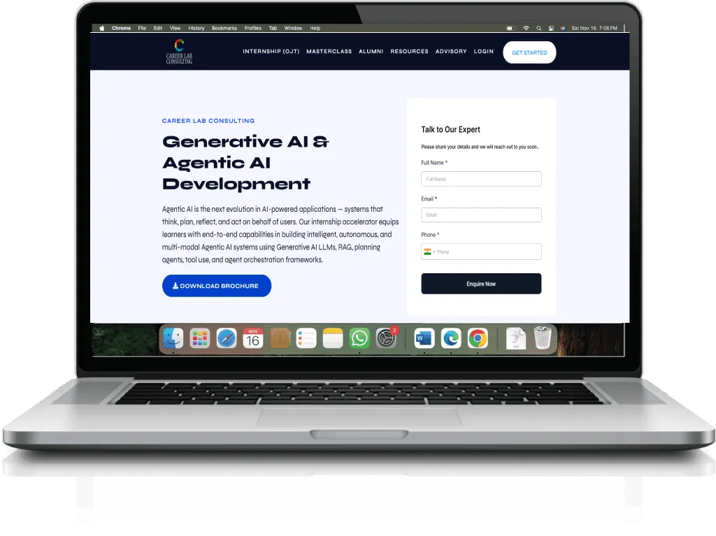 Launch your career with Career Lab Consulting’s InternX–AI Program, one of India’s leading platforms for Generative and Agentic AI Development. Learn from industry experts, work on live AI projects, and gain hands-on experience with LLMs, RAG, LangChain, AutoGen, and CrewAI.